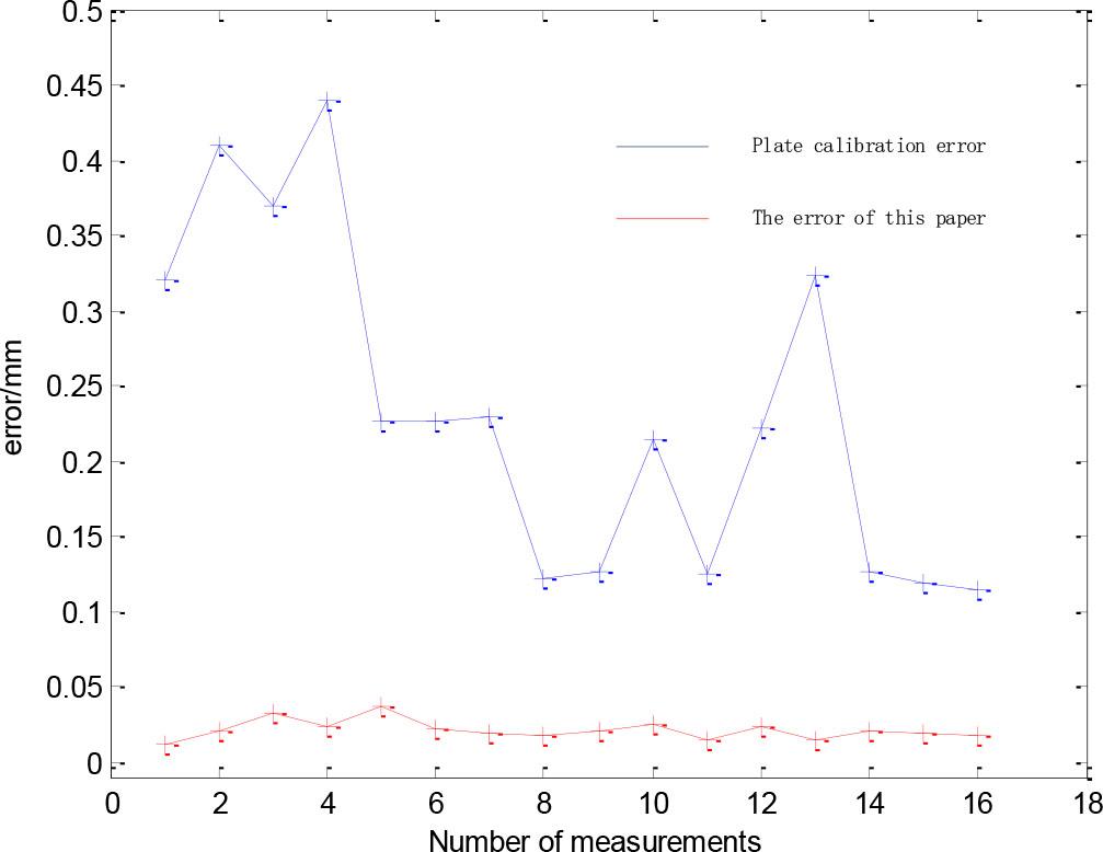 Comparison of precision between the calibration algorithm proposed in this article and the traditional flat-plate calibration algorithm.