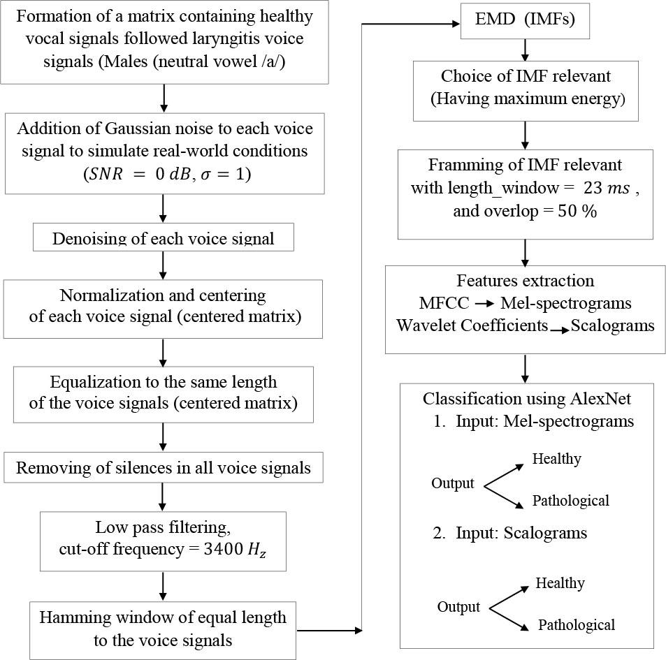 Laryngeal pathologies are disorders that affect the larynx, which houses the vocal folds, leading to various voice problems [1], [2], [3]. Early detection of these pathologies is crucial to prevent permanent damage to the vocal folds and to significantly improve the effectiveness of treatment. The diagnosis of voice disorders usually requires invasive clinical examinations such as laryngoscopy and videostroboscopy. However, vocal signal analysis using the signal processing techniques can be used to extract features that help distinguish between healthy and pathological voices. Therefore, there is a growing need to develop a non-invasive, automated approach based on deep learning to identify pathological voices. A substantial body of related work exists in this domain [4], [5], [6], [7], [8], [9], [10], [11], [12], [13], [14]. Many studies focus on the extraction of signal processing features such as MFCCs and Wavelet Packet Transform (WPT) [15], [16], [17], [18], [19], [20], as well as the use of deep learning for voice pathology detection [21], [22], [23]. This paper focuses on the detection of laryngeal pathologies using MFCC spectrograms and scalograms — time–frequency representations — derived from the most relevant IMFs. These representations are used as inputs to the AlexNet convolutional neural network (AlexNet-CNN) for automatic classification of normal and pathological voices. This study investigates the use of scalogram representations with AlexNet-CNN for pathological voice detection, an approach that has received little to no attention in the existing literature. The adopted processing workflow is illustrated in the synoptic diagram (Fig. 1). Once the relevant IMFs are extracted from each vocal signal, the signal is segmented, and the MFCCs are calculated for each segment. In parallel, scalograms are generated using continuous wavelet transform (CWT). These MFCC images and scalograms are then used as input to the AlexNet-CNN convolutional neural network for classification. This paper is organized as follows: Section 2 presents the materials and related methods, detailing the methodology and the detection process. Section 3 reports and discusses the results. Finally, the paper concludes with a summary of the results and a comparison of recent studies on pathological voice classification.
