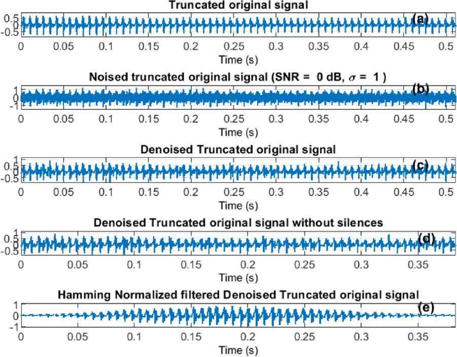 A Hamming window was applied to each pre-processed voice signal to reduce spectral leakage by truncating the signal at its edges (Fig. 2).