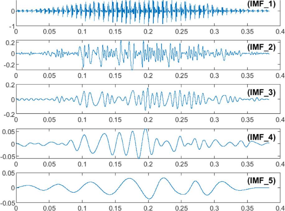 EMD, introduced by Huang et al. [26], is an adaptive and fully data-driven method designed for analyzing nonlinear and non-stationary signals. The EMD method can self-adaptively decompose a complicated multicomponent signal into a finite set of components known as IMFs without any a priori assumptions (Fig. 3). Due to its adaptive nature, EMD is particularly well-suited for the analysis of biomedical and voice signals. It enables for the isolation of the most informative oscillatory modes and thus the extraction of relevant features — such as MFCCs or scalograms — from the most energetically significant IMF. We used a Huang’s Empirical Mode Decomposition for the signal analysis. The EMD algorithm is explained next [26], [27], [28]. Let x(t) be a real-valued, non-linear and non-stationary signal. EMD expresses x(t) as the sum of N IMFs and a final residual component r(t):