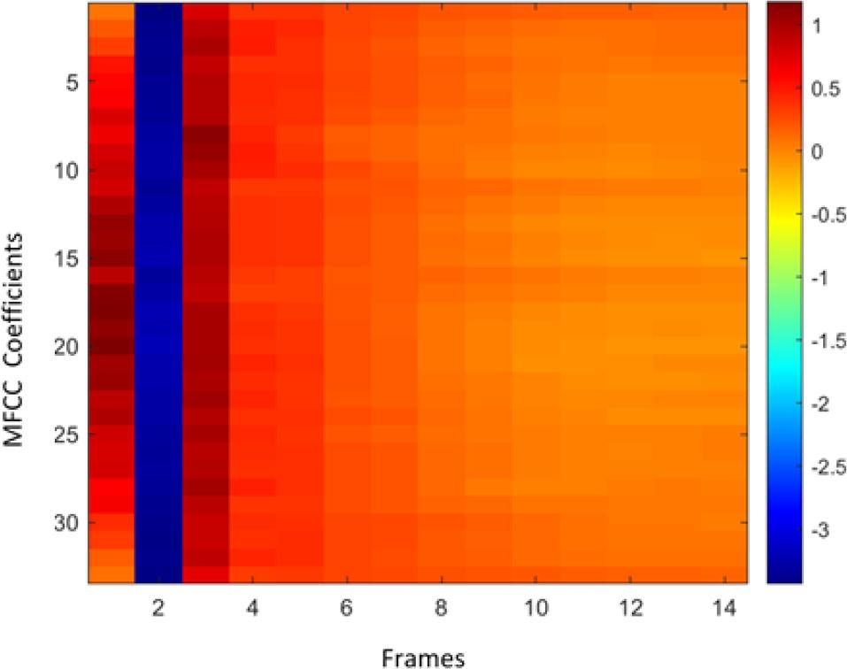 Once the relevant IMF was selected, it was segmented into overlapping frames for Mel-frequency cepstral coefficient (MFCC) extraction. Each IMF was divided into frames of 23 ms duration, with a 50 % overlap between consecutive frames to ensure smooth temporal continuity and to capture transitional acoustic features. For each windowed frame, MFCCs were calculated by transforming the power spectrum into the Mel scale using a bank of triangular filters spaced according to the Mel frequency warping function. This process resulted in a time–frequency representation of the relevant IMF in the perceptually motivated Mel scale. The MFCCs were then aggregated into Mel-spectrogram images, which were subsequently used as inputs for the classification stage (Fig. 4).