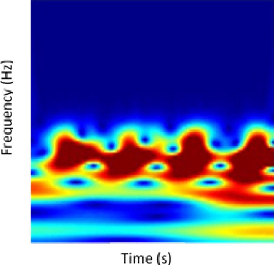Scalogram example derived from the most energetic IMF of a pre-processed voice signal using CWT. The representation highlights relevant time-frequency patterns for the subsequent classification of healthy and pathological voices.