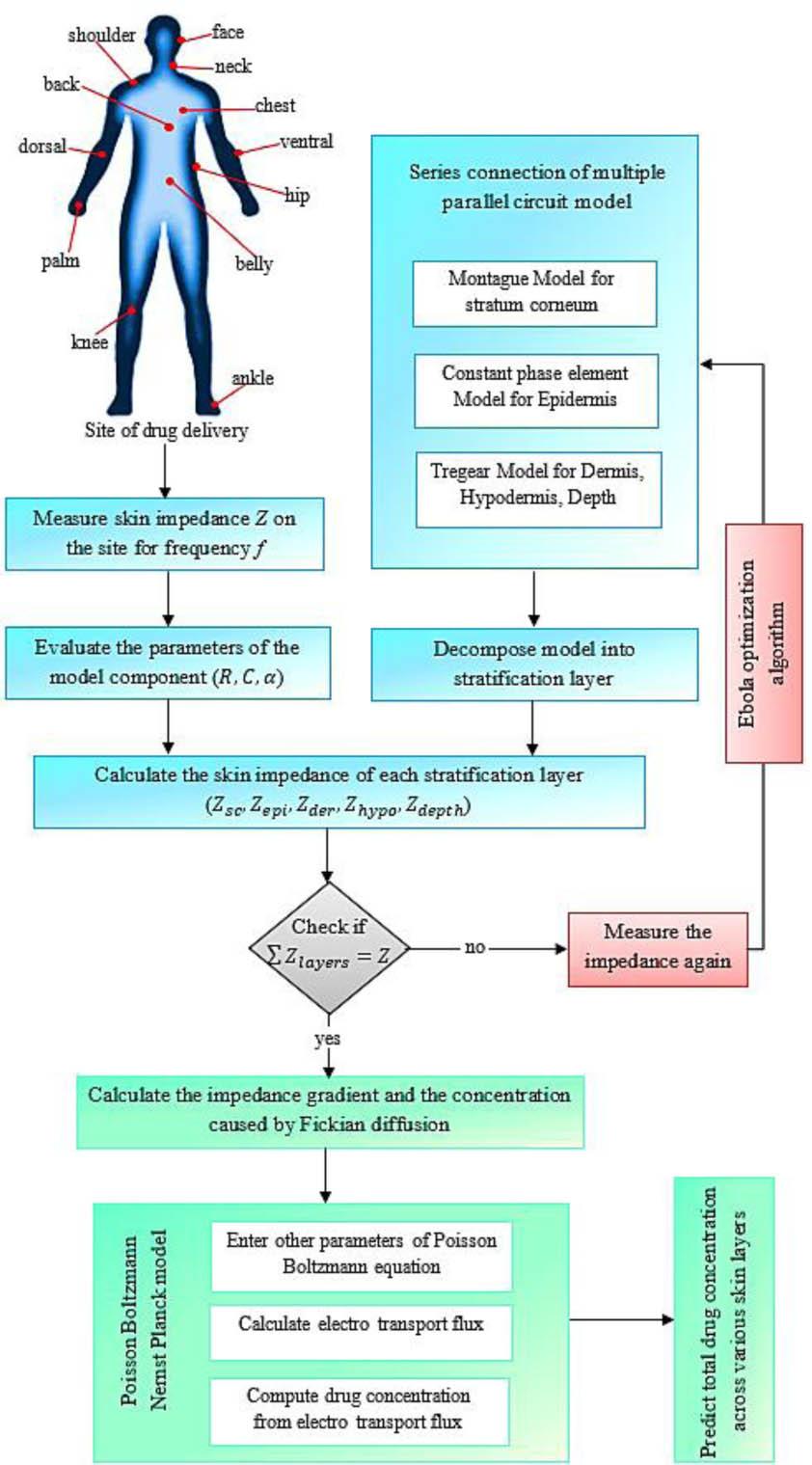 In this section, we present a systematic approach to device-assisted TDD by integrating advanced modelling techniques and an optimisation algorithm. The SLRC circuit is introduced to analyse the impedance characteristics of different skin layers during drug delivery. The PBNP model enables precise calculation of electrotransport flux and drug concentrations across various skin layers by improving the predictive performance of drug delivery systems. The overall workflow of the proposed methodology is shown in Fig. 1.