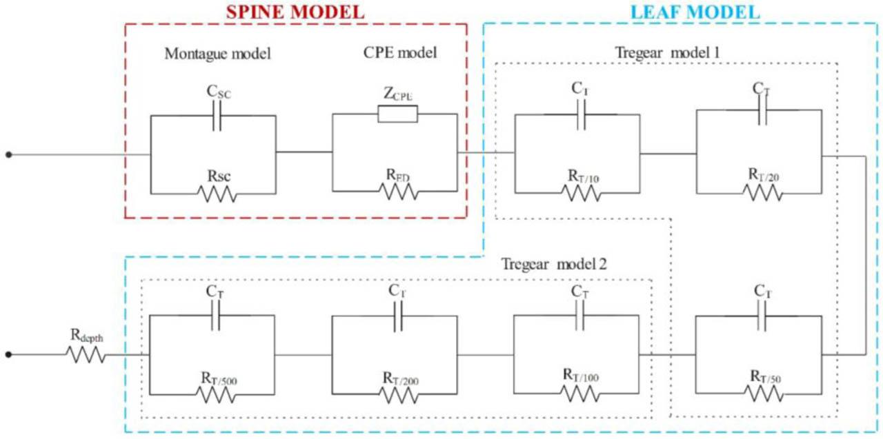 The proposed Spine leaf model represents both the biological characteristics and physiological stratification of skin. A parallel combination of a resistor (Rsc) and CPE (RED) represents the combined impedance of the SC and epidermis. Three parallel combinations of different resistors (RT) and a capacitor (CT) represents the various layers of the dermis, hypodermis, and depth layers. The resistance of the deepest layer is denoted by a low-value resistor, Rdepth. The values are (RT = RSC) Ω, (CT = A), and Rdepth = 200 Ω. Equation (7) gives the equivalent impedance function for the hybrid model.