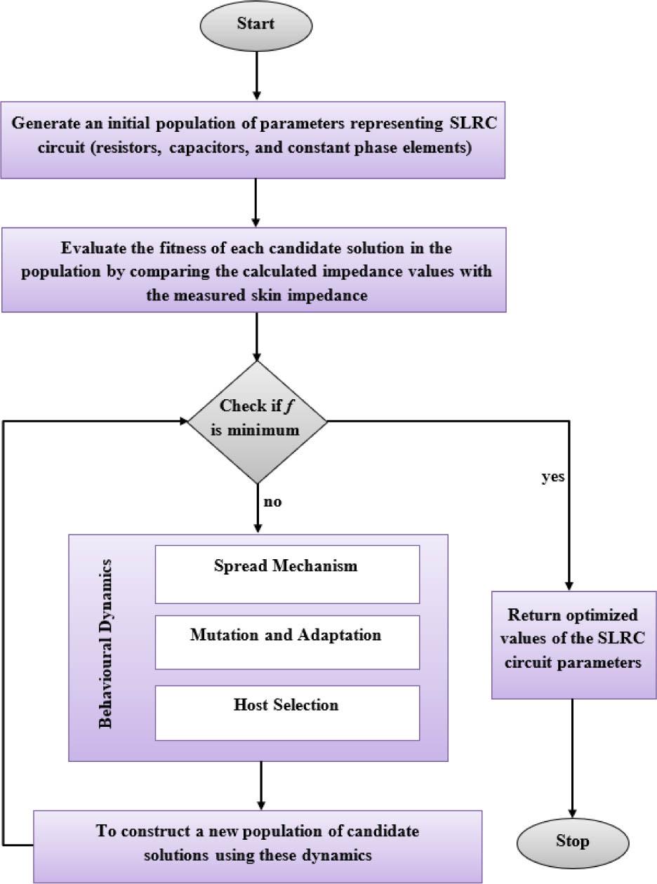 In this section, the parameters of the proposed SLRC circuit are obtained from the impedance dataset using a non-linear least squares fitting in MATLAB. The EOA [24] is applied to optimise the simulated parameters to fit into the collected dataset, as shown in Fig. 4. EOA is a nature-inspired metaheuristic optimisation technique modelled after the propagation dynamics of the Ebola virus. In the context of the proposed SLRC circuit, EOA is used to optimise simulated circuit parameters (such as resistance R and capacitance C) to fit experimental data or a collected dataset. The EOA addresses the limited optimisation problem through the following steps: