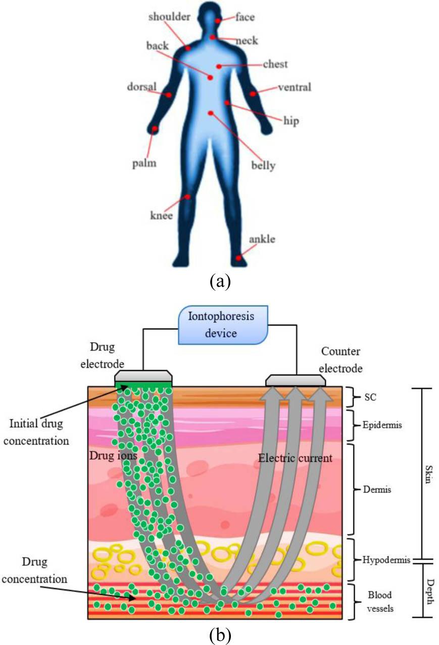 Visual representation of (a) Anatomical sites on the human body considered for iontophoretic drug delivery simulation. (b) Simulated drug concentration profiles across skin depths using the proposed model.