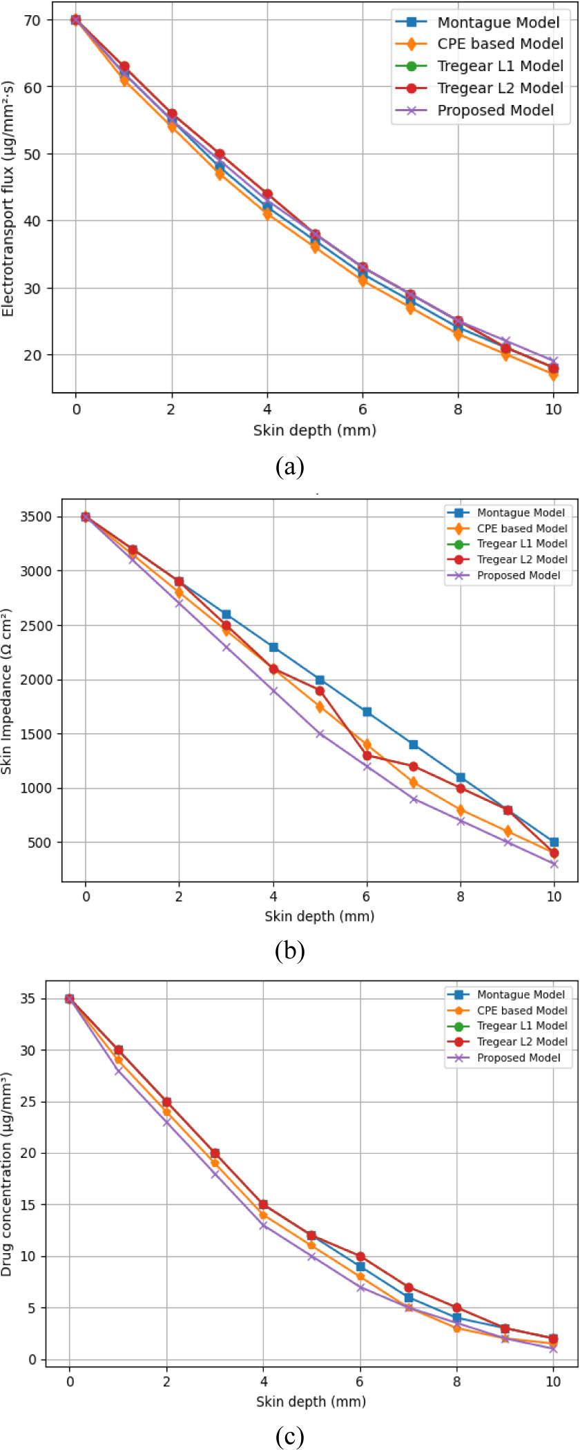 In Fig. 6, the Montague model, computational fluid dynamics (CFD)-based model, Tregear 1&2 models, and the Proposed model are among the models used to analyse variations in parameters associated with drug delivery through skin depth. In Fig. 6(a), skin impedance decreases with increasing skin depth, which is crucial for assessing drug penetration. Fig. 6(b) shows a decrease in electrotransport flux across deeper epidermal layers as epidermal depth increases. Fig. 6(c) shows that medication concentration, as determined by the electrotransport mechanism, decreases with greater skin penetration. Due to their consistent trends, these models provide reliable forecasting of drug delivery performance.