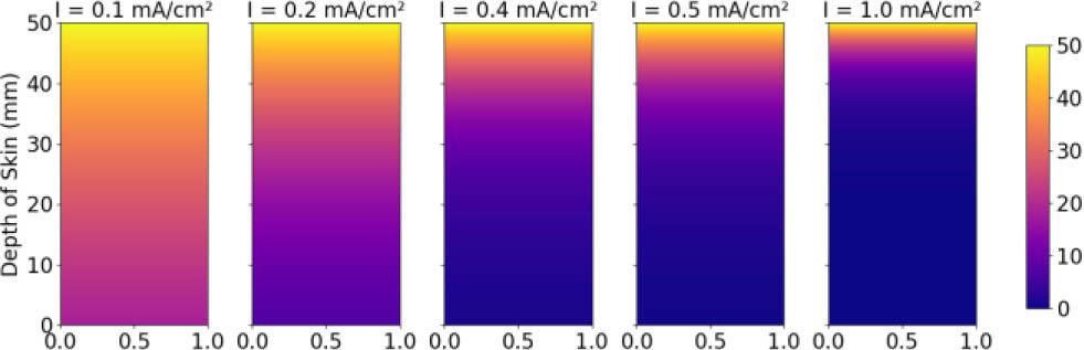 Fig. 7 shows the distribution of drug concentration (μg/mm3) across different skin depths (0–10 mm) under varying current densities (0.1, 0.2, 0.4, 0.5, and 1.0 mA/cm2). Higher current densities result in deeper drug penetration but lower concentrations at the surface. The colour gradient indicates drug concentration, with yellow representing higher values and purple representing lower values. Drug concentration decreases as skin depth increases for all current densities. This highlights the effect of current density on drug delivery efficiency and depth of penetration.
