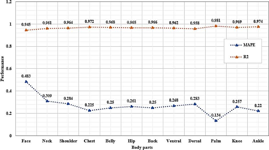 Analysis of the proposed model based on MAPE and R2 values across various body regions.