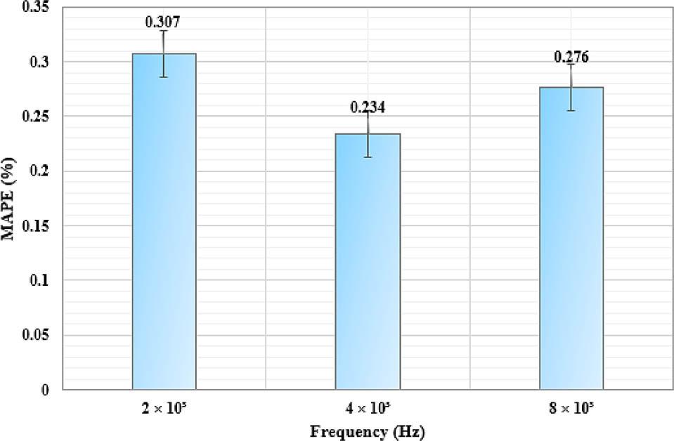 Fig. 9 shows the impact of current frequency on prediction accuracy using MAPE as the evaluation metric. Among the tested frequencies, 4 × 103 Hz produced the lowest MAPE (0.234 %), indicating optimal conditions for drug penetration. The reported MAPE values at 2 × 103 Hz and 8 × 103 Hz were higher, indicating inferior impedance behaviour. This demonstrates the importance of frequency tuning for effective transdermal drug delivery.