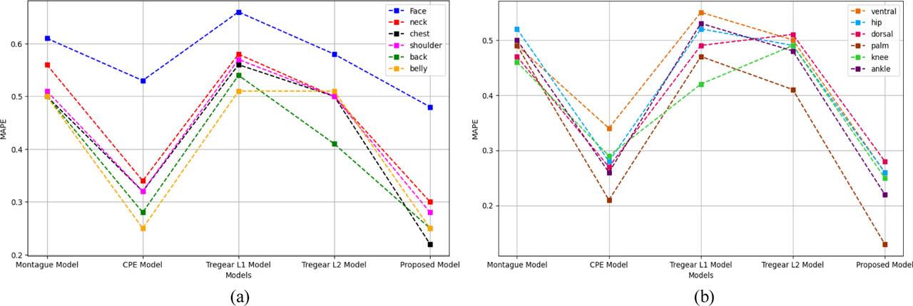 MAPE value comparison of different models for different body parts (a) Upper body regions and (b) Lower body regions.
