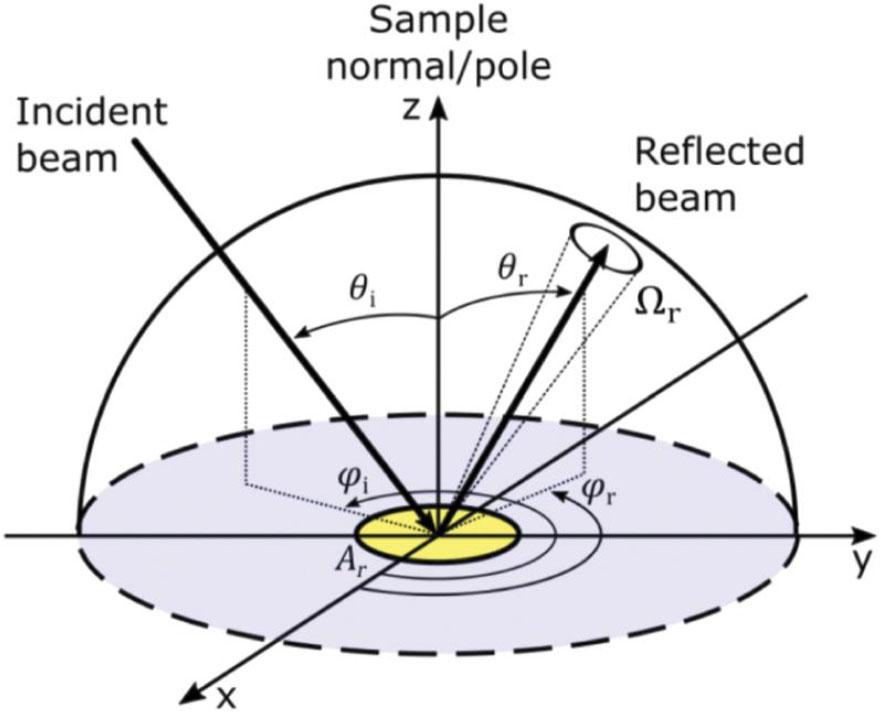 BRDF is a function describing the transformation of radiance of a surface element in the given observation angle at a given wavelength λ, Lr(θr,ϕr,xr,yr,λ), depending on the illumination direction (θi,ϕi) and the observation direction (θr,ϕr) in relation to the irradiance incident on the environment from a given direction at a given wavelength Ei(θi,ϕi,λ). [3]