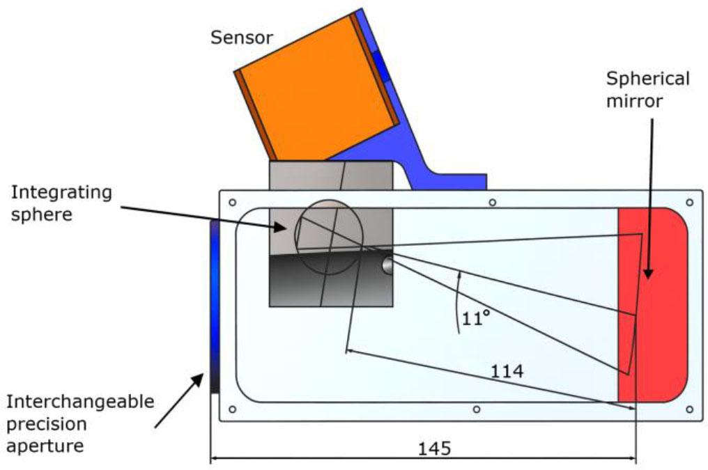 The system incorporates an aperture, a mirror, and sensors integrated into a small, compact integrating sphere. To suppress inter-reflections, a mirror with a focal length of 150 mm is employed in place of a lens. The mirror is tilted by 5.5° along both horizontal and vertical axes to minimize stray light and improve measurement fidelity.