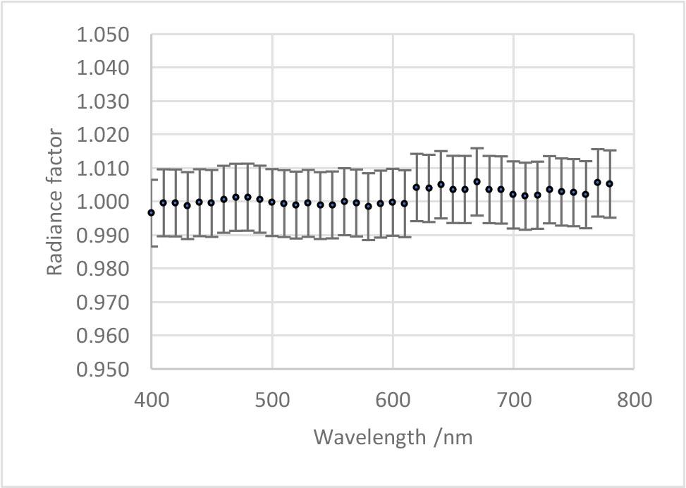 The measurement uncertainty budget is presented in Table 1. The individual input parameters of the measurement system are presented in the first column of the table. The uncertainty contributions to the spectral radiance factor (the spectral radiance factor is a relative quantity) measured value are stated in the second column.