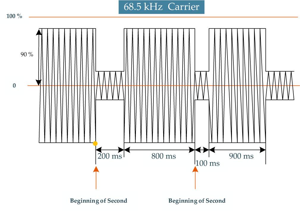 The National Time Service Center (NTSC), Chinese Academy of Sciences, built a BPC time service station in Shangqiu City, Henan Province, in 2008. The call sign is BPC, and the transmission power is 100 kW. The broadcasting frequency of BPC radio is 68.5 kHz. At the start of each full second, the pulse amplitude drops to 90 % of the original amplitude. The widths of the falling pulses are 100 ms, 200 ms, 300 ms and 400 ms, respectively. As shown in Fig. 1, BPC uses a pulse width modulation signal format as its signal structure, and the passband is 67.5 kHz to 69.5 kHz.