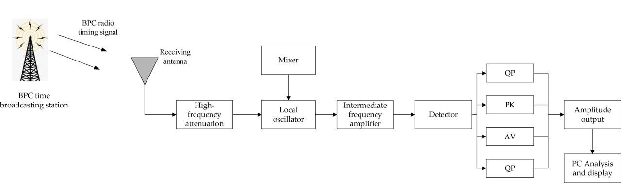 The experimental group established a BPC timing signal measurement system, which consists of an antenna receiving module and a signal processing and display module, as shown in Fig. 3. The circular magnetic antenna of the electromagnetic interference interferometer receives BPC timing signals with a carrier frequency of 68.5 kHz [19]. The antenna receives the BPC timing signal, which then passes through the radio frequency circuit. After mixing, amplification, detection, and filtering, the field strength is obtained. The signal processing and display module processes the data, and the real-time measurement data is collected and stored through the upper computer software [20].