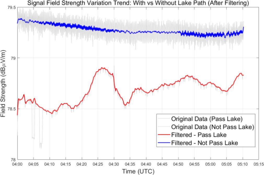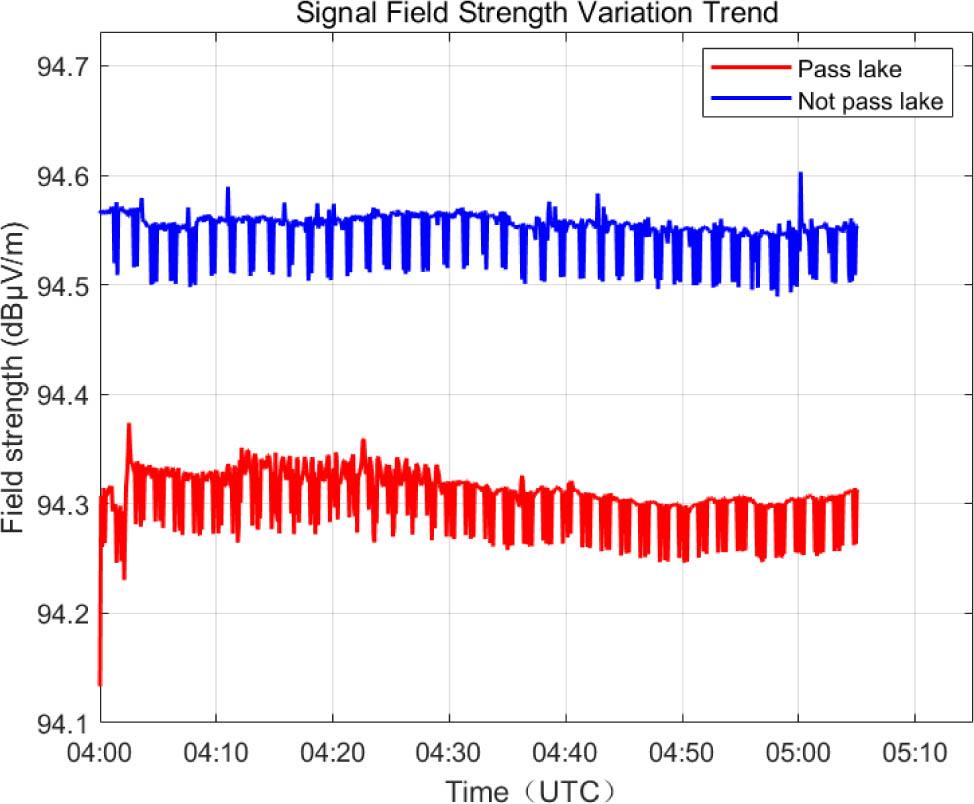 We conducted signal field strength tests at two locations 138 km from the broadcasting station. The raw data underwent 3 σ outlier processing and smoothing filtering, effectively eliminating “spikes” and “jumps.” The filtered field strength trend diagram is shown in Fig. 7.