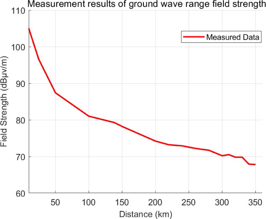 Within the ground wave region, signals maintain stable levels due to the proximity of receiving terminals to broadcasting stations. We conducted experimental studies on signal field strength within the ground wave coverage area at distances ranging from 10 to 300 km from the Shangqiu broadcasting station. By increasing the distance between the timing broadcast station and the receiving location, we analyzed the relationship between distance and field strength to validate the attenuation patterns.