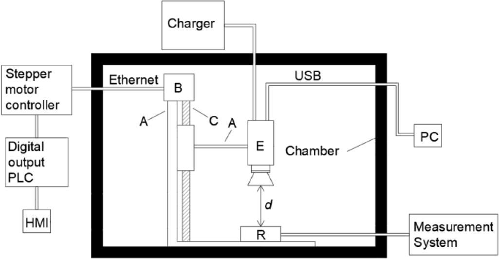 To obtain reliable results of the thermographic measurement of temperature Tpcam, a dedicated measurement setup was designed and built. Its main component was the Flir E50 thermal imaging camera operating in the long wavelength infrared (LWIR) range. The device is equipped with an array of uncooled microbolometer detectors with a resolution of 180 × 240 pixels. The instantaneous field of view (IFOV) value is 1.82 mrad, which allows nine detector fields to be projected onto the relay package surface. The noise equivalent differential temperature (NEDT) parameter of 50 mK [18] enables the detection of small temperature variations on the package surface. The camera was mounted on a tripod, allowing precise adjustment of the distance d between the lens and the tested relay. The entire setup was placed inside a plexiglass chamber with dimensions of 40 × 30 × 30 cm. To minimize reflections, the interior of the chamber was lined with polyurethane foam. A schematic diagram of the constructed measurement system is shown in Fig. 1.
