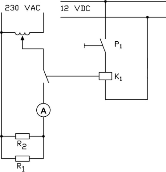 Measuring system that enables relay control. K1 – tested relay, R1, R2 – load, P1 – button.