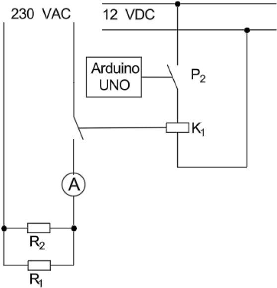 Measuring system used to force a specific number of relay switching cycles. P2 – button controlled by an Arduino Uno microcontroller.