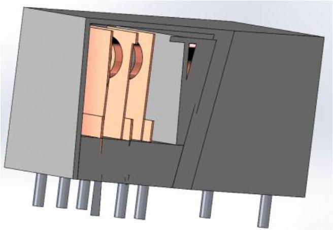 The second stage of the indirect thermographic measurement involved determining the relationship between the contact temperature Tc and the package temperature Tpcam. For this purpose, a three-dimensional relay model was developed and analyzed using the finite element method (FEM). The modeling was performed using SolidWorks software. The created 3D model is presented in Fig. 4, while Table 1 lists the materials used in the model along with their thermal conductivity coefficients λ.