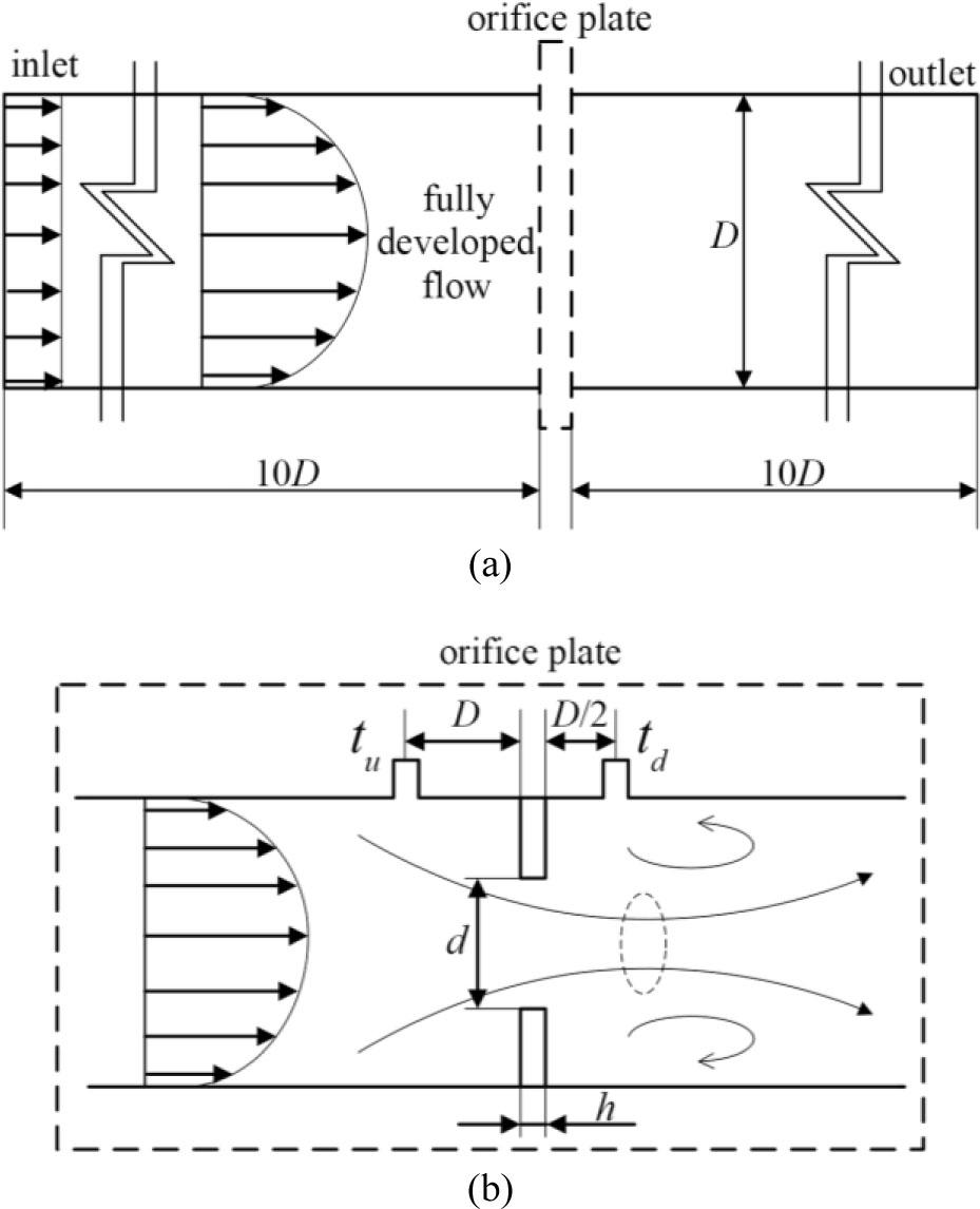 In this study, to examine the influence of chamfered structures on the flow characteristics of the orifice plate, an orifice plate was modeled as shown in Fig. 2. The pipe diameter is denoted as D, the orifice diameter is denoted as d, and the orifice plate thickness is represented by h (Fig. 2(b)). To ensure that the upstream flow reaches a fully developed state and that the downstream flow stabilizes, the lengths of the straight pipes upstream and downstream of the orifice plate were both set to 10D (Fig. 2(a)). The pressure taps used to define the differential pressure across the orifice plate are indicated by tu and td in Fig. 2(b). The chamfered edge structure of the orifice plate investigated in this study is illustrated in Fig. 3, where e denotes the orifice bore thickness, and α represents the chamfer angle.