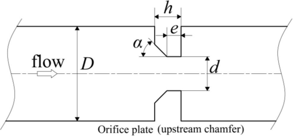 Geometric definition of a chamfered orifice plate: pipe diameter D, orifice diameter d, plate thickness h, orifice bore thickness e, and chamfer angle α.