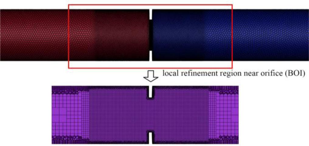 In this study, ANSYS Fluent Meshing was used to generate the computational mesh using a poly-hexcore approach. The meshing procedure is illustrated in Fig. 4. First, a global mesh was generated for the entire fluid domain. Then, local refinement was applied to regions with strong gradients and complex flow features using the body of influence (BOI) method, with particular emphasis on the vicinity of the orifice plate and the near-wake region where jet contraction, separation, and recirculation occur. In addition, since steep velocity and pressure gradients develop near solid boundaries, prism layers were generated along the pipe wall and the orifice bore to improve near-wall resolution and capture boundary layer behavior. The simulations employed the standard k-ɛ turbulence model with standard wall functions, the inflation layer parameters were designed to maintain wall y+ values within the recommended range across the investigated Reynolds numbers. A mesh independence study was conducted to determine the final mesh resolution and is reported in the next section.