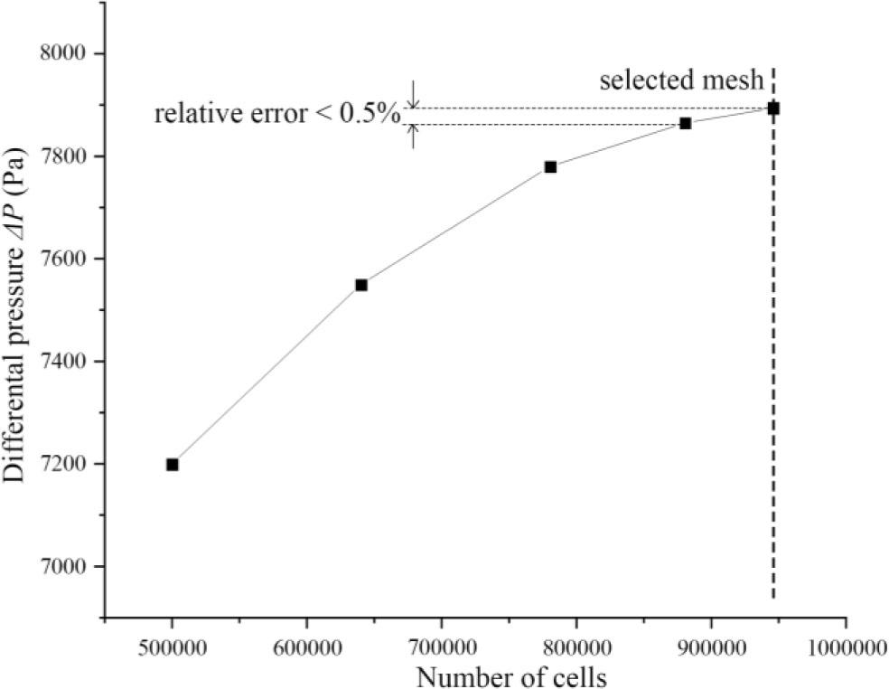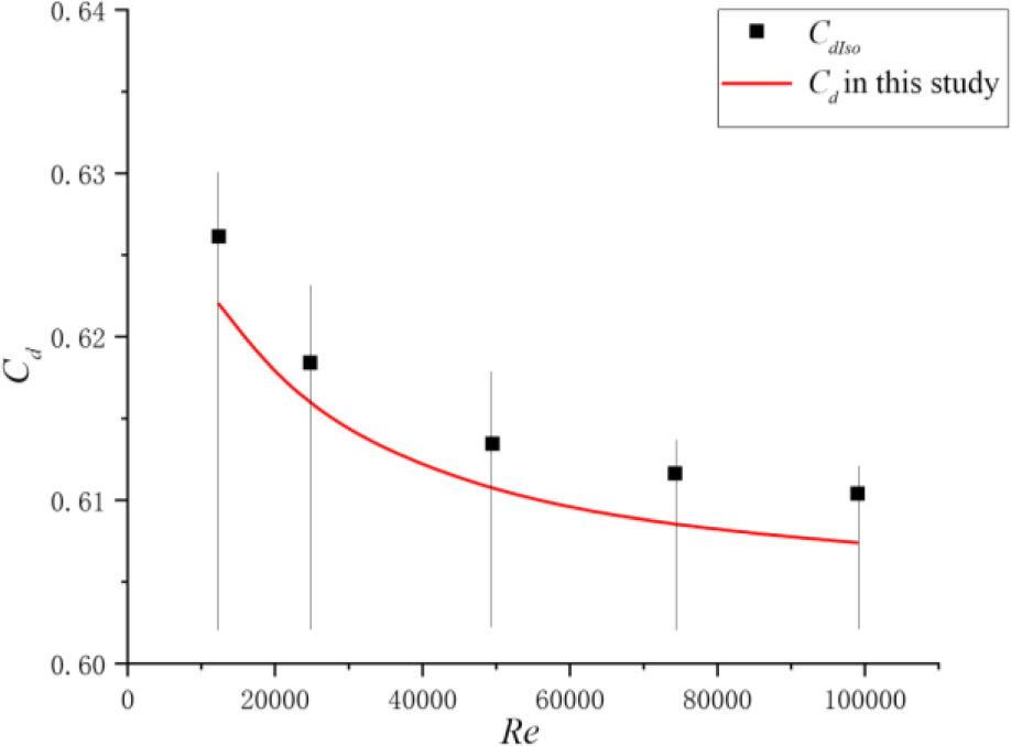 The credibility of CFD predictions depends on both numerical resolution and the capability of the adopted model to reproduce benchmark flow metering characteristics. Accordingly, numerical credibility is established through a mesh sensitivity assessment and an independent benchmark of the discharge coefficient Cd against ISO 5167 reference values. A mesh sensitivity study was carried out by progressively refining the grid and tracking the differential pressure ΔP across the orifice plate. The comparison of ΔP obtained with different cell numbers is shown in Fig. 5. When the total number of cells exceeds 900000, the variation of ΔP becomes negligible, indicating that the solution is insensitive to further mesh refinement. Considering both accuracy and computational cost, the mesh with approximately 900000 cells was selected for all subsequent simulations. In addition, the predictive fidelity for metering performance was examined by comparing the simulated discharge coefficient Cd with the ISO 5167 reference values over the Reynolds number range considered in this work. Fig. 6 presents the comparison between the ISO based Cd and the CFD-predicted Cd. The CFD results exhibit the same decreasing trend of Cd with increasing Re, and the deviation from the ISO reference is consistently small: the mean absolute deviation is 3.41 × 10−3, and the maximum relative deviation is 0.66 % within the investigated Reynolds number range. This agreement, together with the grid independence results, supports the numerical reliability of the present CFD methodology for evaluating the hydraulic characteristics of chamfered orifice plates under the investigated conditions.