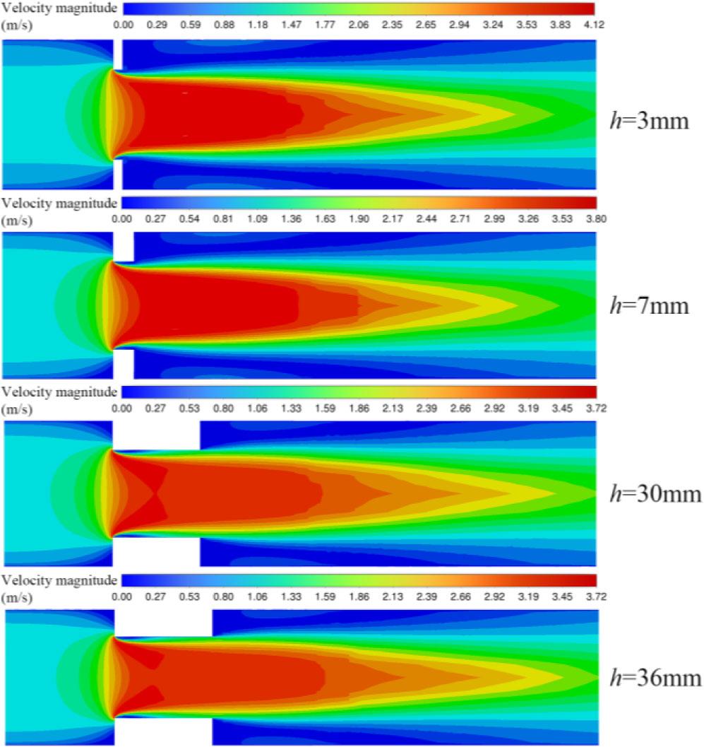 Fig. 7 illustrates the axial velocity distribution across the throttle orifice plate. From the graph, it is evident that as the thickness of the orifice plate increases, the maximum jet velocity of the fluid passing through the orifice plate gradually decreases. This effect is particularly pronounced for thinner plates, while for plates with a relative thickness t > 0.5, the influence of plate thickness on the maximum jet velocity becomes negligible. This behavior can be attributed to the differences in jet dynamics as the fluid passes through thin versus thick plates. As shown in Fig. 8, for thin plates (with h = 3 mm and h = 7 mm), the maximum jet intensity occurs immediately behind the orifice plate. In contrast, for thicker plates (with h = 30 mm and h = 36 mm), the maximum jet intensity is observed inside the orifice plate. For thin plates, the jet expands only once as the fluid passes through, whereas for thick plates, the jet initially expands inside the orifice and then undergoes a second expansion after exiting the orifice. As a result, the fluid's motion becomes smoother after the two expansions, leading to a lower maximum jet velocity for thick plates compared to thin ones.
