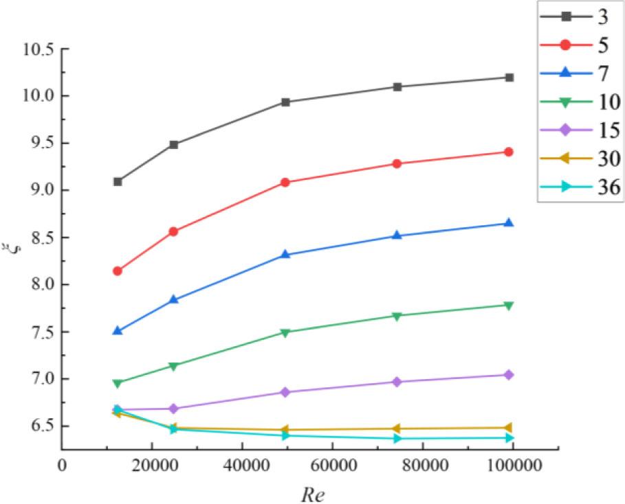 Fig. 9 shows the dependence of the pressure loss coefficient ξ on the Reynolds number for orifice plates with different thicknesses. A pronounced thickness effect is observed: increasing plate thickness leads to a lower ξ over the investigated Reynolds number range. Moreover, opposite Reynolds number trends appear for thin versus thick plates — ξ increases with Re for thinner plates, whereas it gradually decreases with Re as the plate becomes thicker. This reversal is attributable to the different development of the near-wall boundary layer inside the orifice bore, which modifies the effective contraction process and, consequently, the irreversible loss. From a design perspective, increasing the plate thickness can be an effective way to reduce pressure loss, particularly at higher Reynolds numbers.