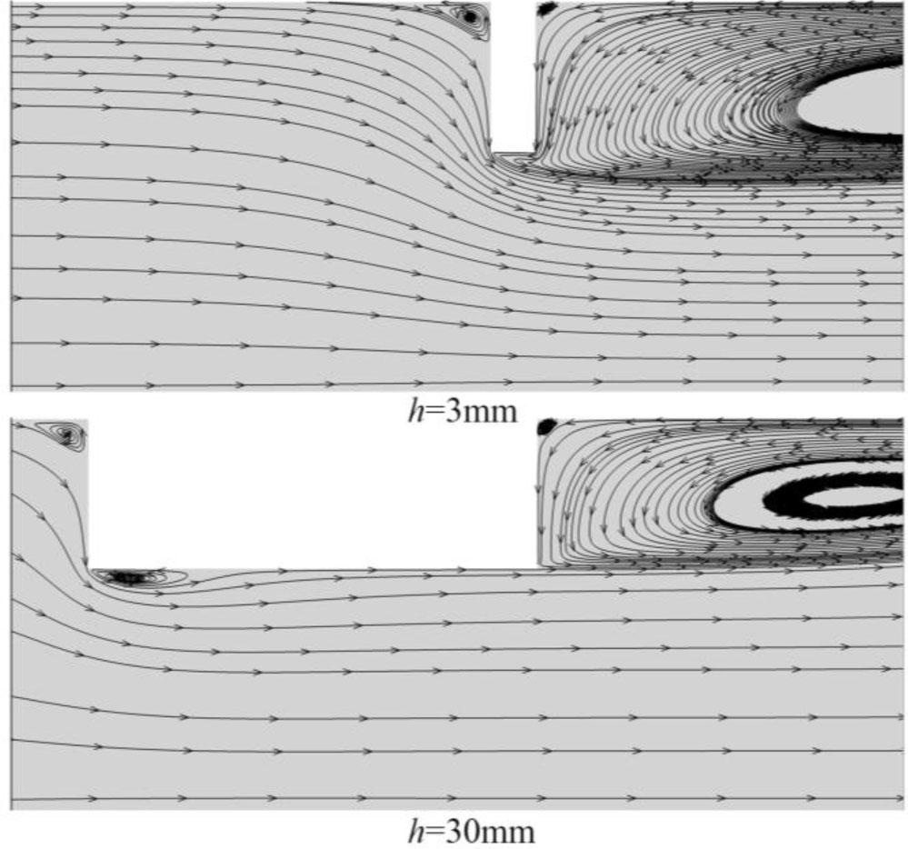 Fig. 10 illustrates the streamline distribution near the throttle orifice for both thin and thick orifice plates. From the graph, it can be observed that for the thin orifice plate with h = 3 mm, the short length of the throttle orifice results in the entire wall area being within a low-pressure zone. Consequently, vortices formed behind the orifice plate penetrate the interior of the orifice. In contrast, for the thick orifice plate with h = 30 mm, the low-pressure zone and vortices generated by the jet are confined to the region near the orifice entrance. After passing through the low-pressure zone, the fluid begins to expand inside the throttle orifice, forming a new boundary-layer flow.