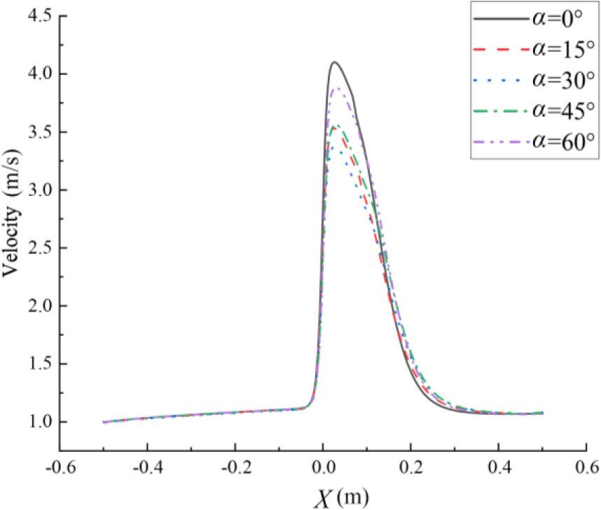 Fig. 11 presents the velocity profiles along the centerline for both the standard orifice plate and the various chamfered orifice plates. The data indicate that the maximum jet velocity of the chamfered orifice plates is notably lower than that of the standard orifice plate. Specifically, when the chamfer angles are 15°, 30°, and 45°, the reduction in the maximum jet velocity is particularly pronounced, with a maximum decrease of 17.67 %. This suggests that incorporating an appropriate chamfer structure can effectively enhance the flow field characteristics of the orifice plate.