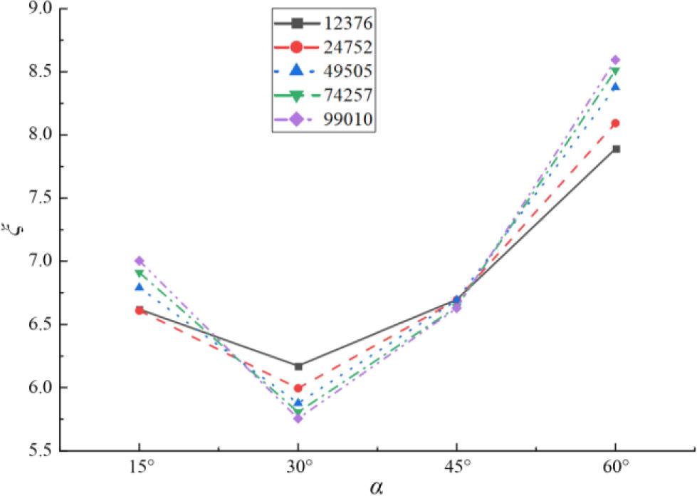Fig. 13 compares the streamline patterns for different chamfer angles and reveals a distinct change in the jet recirculation topology inside the orifice. For α = 15° and 60°, the jet remains concentrated in the pipe core, leaving a low momentum region near the orifice wall that facilitates the inward penetration of the downstream recirculation structures toward the bore wall. In contrast, for moderate chamfers (α = 30° and 45°), the incoming flow is redirected, causing the jet to attach to the wall, which stabilizes the near-wall shear layer and effectively suppresses vortex penetration into the bore region. This flow-structure difference provides a mechanistic explanation for the trends in ξ: as Re increases, the strengthened recirculation promotes vortex penetration and higher losses at α = 15° and 60°, whereas the wall-attached jet at α = 30°–45° becomes more robust and maintains lower losses.
