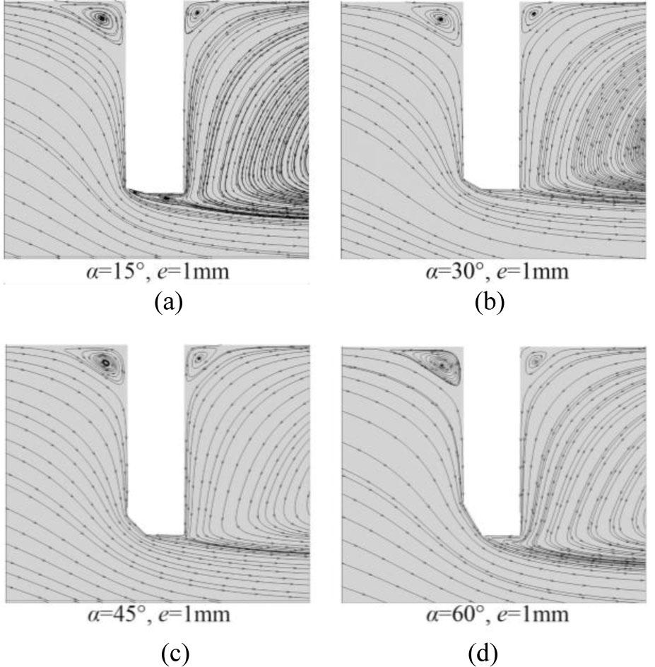 From a practical design perspective, the results indicate that the chamfer angle should be selected to avoid the high loss regime observed at large angles. Within the investigated range, a moderate chamfer angle ranging from 30° to 45° consistently provides lower ξ than α = 60° across the Reynolds numbers considered. This benefit is attributed to the wall-attached jet and the suppression of vortex penetration into the bore region, as evidenced by the streamline patterns in Fig. 13. Therefore, α ≈ 30°–45° can be recommended as a robust choice for reducing pressure loss for the thin-plate case studied here (h = 3 mm), while the effect of bore thickness e is further quantified below.