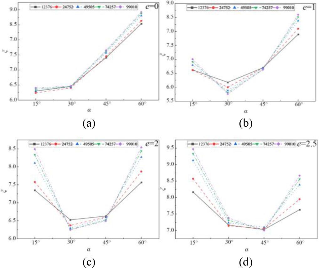 From Fig. 14(d), it can be seen that for e = 2.5, the pressure loss coefficient is minimized at a chamfer angle of 45° and maximized at 15°, with the maximum pressure loss coefficient increasing by 35.3 %.