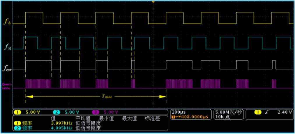 The conventional phase comparison approach cannot use the period of a specific frequency signal as a reference time for phase processing or for direct phase comparison between signals of differing frequencies. This inherent limitation necessitates frequency normalization in traditional phase measurement methods, thereby restricting their application to scenarios involving identical frequencies. Specifically, within the least common multiple period of the two signals, signal fA is designated as the measured signal and fB as the reference signal. For each rising edge of fB, the temporal difference between this edge and the nearest rising edge of fA is defined as the direct time interval between the two signals. Subsequently, the phase comparison results fout are quantized using a high-frequency clock.