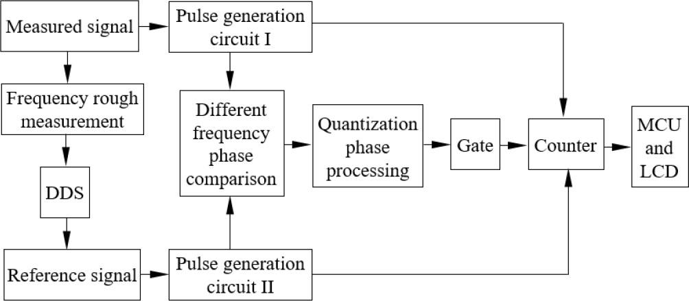 According to the variation law of the group period, precise frequency links are established between signals of different frequencies, and the period of the measured signal is determined using the reference signal. Due to the inherent regularity between the two signals, the coincidence points of the same phase will recur. If the fout signal between fA and fB is processed, and then the phase quantization result of the phase coincidence point is detected by a high-frequency clock, the phase coincidence information can be easily obtained. Simultaneously counting fA and fB and the phase coincidence point, generating a gate using the phase coincidence point, and then counting fA and fB within the same gate time can overcome measurement errors caused by counting errors.