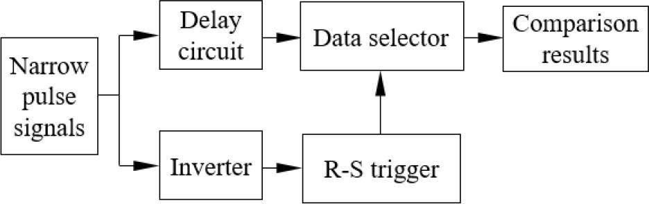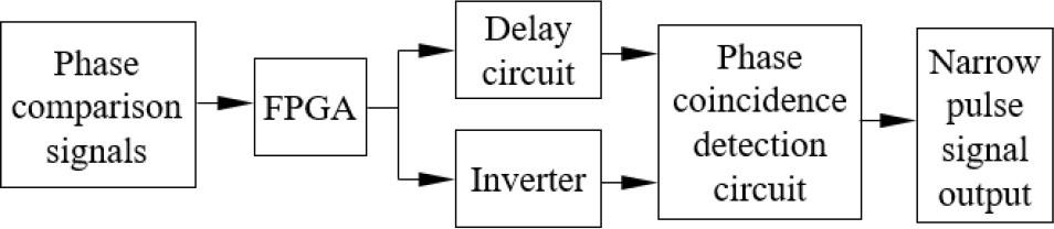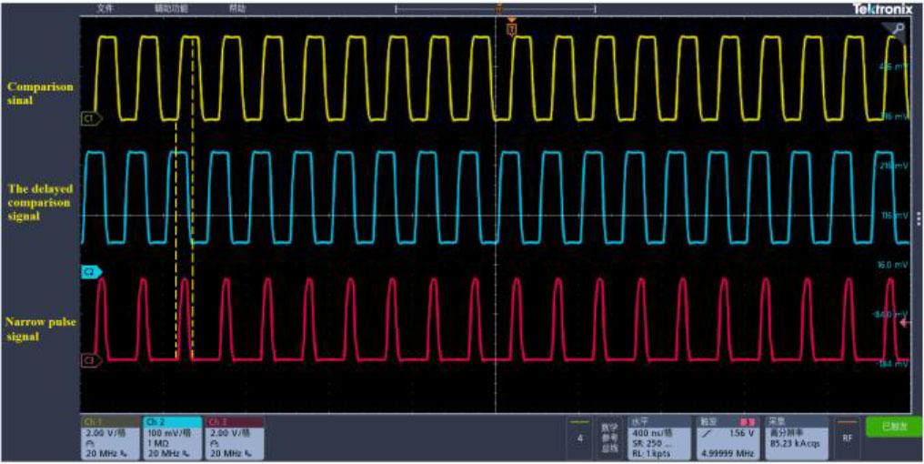 In Fig. 3, the delay circuit is composed of D flip-flops within the FPGA. By adjusting the clock period of the D flip-flop, the pulse width becomes better suited to the required delay. In addition to introducing inherent delay, this circuit also reduces noise in the comparison signal. The square wave pulse signal is sent to an inverter, which generates a signal with a phase opposite to the original square wave pulse. These inverse and delayed square wave pulse signals are then transmitted to a phase coincidence detection circuit composed of “AND” logic gates, resulting in narrow pulse signals at the same frequency as the square wave pulses. Converting the comparison signals into narrow pulses of the same frequency facilitates the formation of phase coincidence points, synchronizes the phase coincidence fuzzy region with the group period interval, and enhances the stability of the gate, thereby improving the accuracy of frequency detection, as shown in Fig. 4.