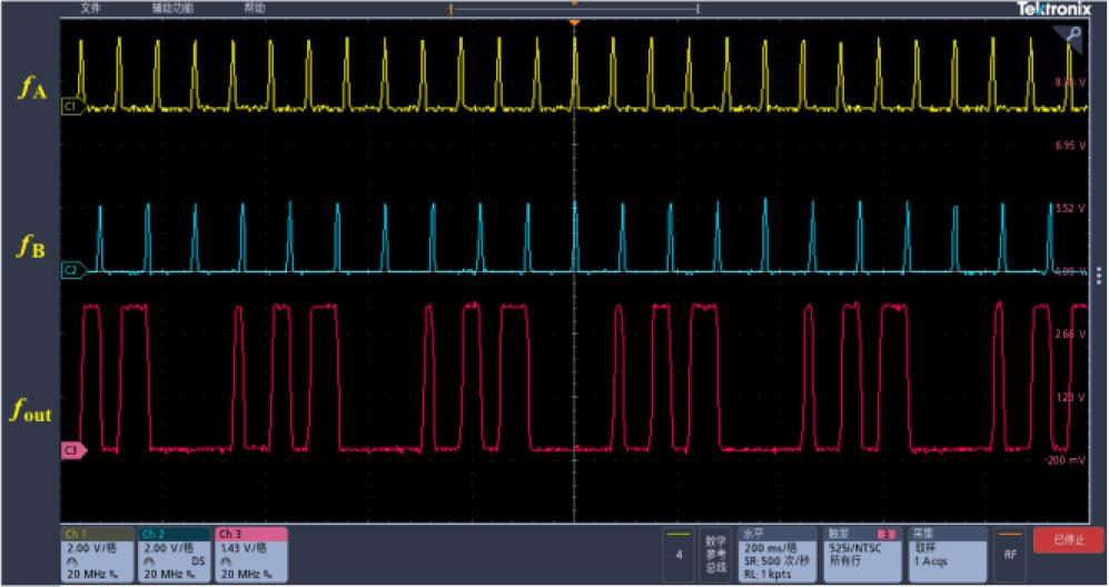 According to the principle of frequency detection based on phase coincidence points, the key to improving frequency detection accuracy lies in accurately identifying and measuring these phase coincidence points. The phase of the shaped signals fA and fB is compared, yielding fout phase coincidence points. Then extract the front and back edges of these phase coincidence points and perform high-frequency clock counting between these edges. The same counting result serves as the trigger signal for opening and closing, and is then transmitted to the MCU (microcontroller unit) for data processing and execution. The frequency detection scheme for this system is shown in Fig. 2.