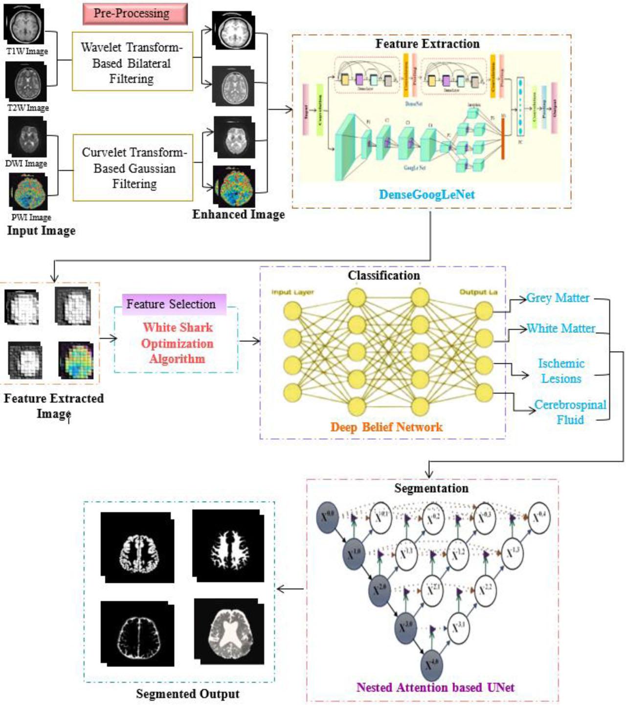 In this section, a novel BTS-NEUNET is proposed for brain tissue segmentation based on multimodal MRI images. Initially, the input brain MRI images, such as T1W, T2W, PWI, and DWI, are pre-processed using the WTBB filter and CTBAGN filter to enhance image quality. Then, the improved DenseGoogLe network is used to extract relevant features from the enhanced multimodal MRI images. A White Shark Optimization Algorithm is used to select the features from the MRI images. The DBN classification network is used to segment four types of brain tissue: white matter, grey matter, cerebrospinal fluid, and ischemic lesions. Finally, the four types of brain tissues are segmented using a Nested Attention-based U-Net. Fig. 1. illustrates the proposed BTS-NEUNET method.