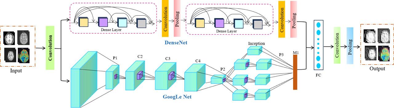 In this section, the denoised MRI images are processed using DenseGoogLeNet for feature extraction. It is a combination of DenseNet and an inception model from GoogLeNet. It uses a hierarchical feature-extraction approach, combined with effective feature reuse, to extract relevant characteristics from images. DenseNet is a cutting-edge CNN architecture for visual object detection that uses fewer parameters. With a few key differences, DenseNet and ResNet are relatively comparable. The architecture of DenseGoogLeNet is shown in Fig. 2.