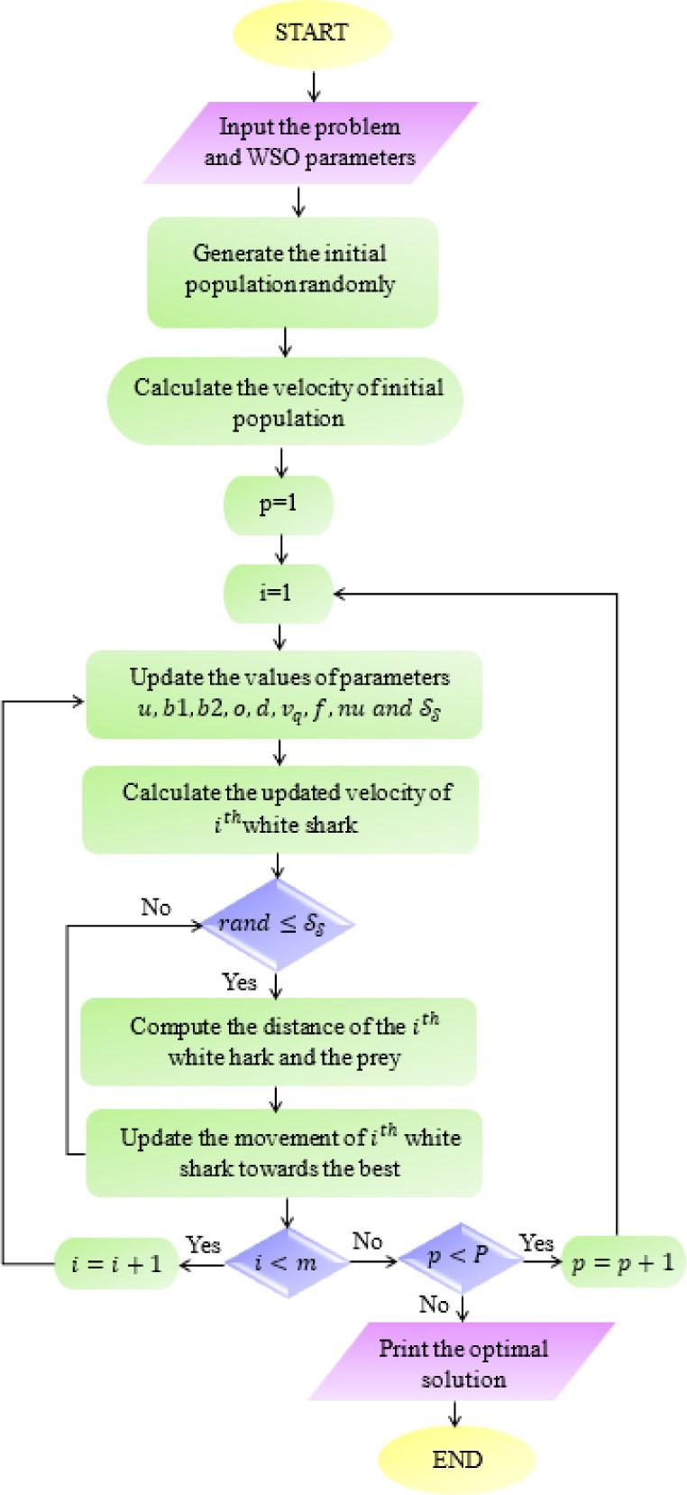 The maximum and minimum speeds at which great white sharks can move are denoted by bmax and bmin. In this scenario, pmax and pmin are assumed to be 1.5 and 0.5, respectively. The flowchart of White Shark Optimization Algorithm is shown in Fig. 3.