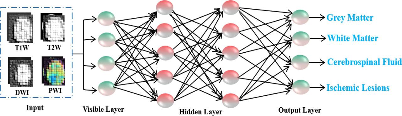 A Deep Belief Network (DBN) classification network is used to segment the white matter, gray matter, cerebrospinal fluid, and ischemic lesions of the brain.