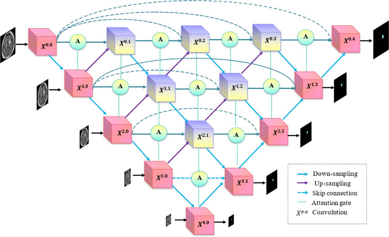 A Nested Attention-based U-Net is used to segment the brain tissue diseases of the classified white matter, cerebrospinal fluid, grey matter, and ischemic lesions. Combining task-related selections with features extracted at other craters is possible. Fig. 5 depicts the Nested Attention U-Net topology. The Nested Attention U-Net is composed of a decoder and an encoder, connected by a series of thick nested convolutional blocks.