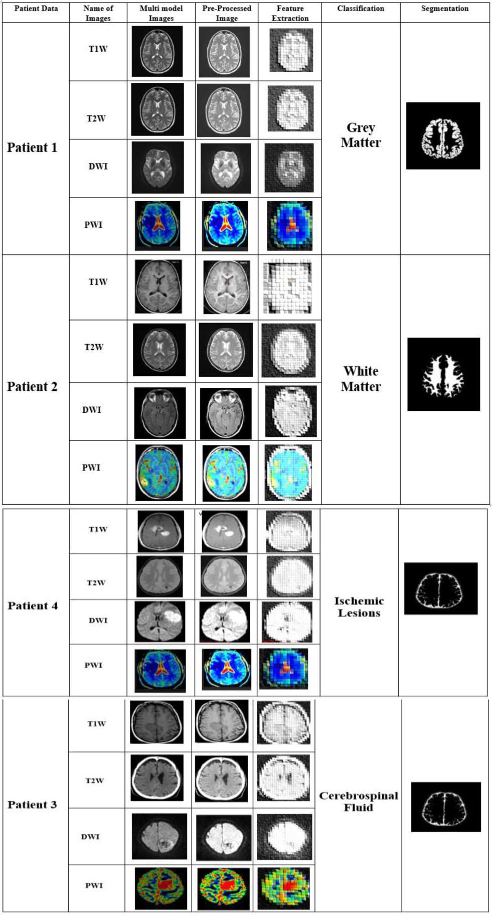 Fig. 6 illustrates the virtual result of the proposed BTS-NEUNET method using the ADNI and ISLES datasets. The patient data are described in column 1. The names of the multimodal MRI images, such as T1W, T2W, DWI, and PWI, are displayed in column 2. The brain's multimodal MRI images are presented in column 3. The pre-processed multimodal images are described in column 4. The feature extracted images are illustrated in column 5. Column 6 shows the four classification outcomes of the proposed BTS-NEUNET approach. Finally, the segmented output of the brain tissue is illustrated in column 7.