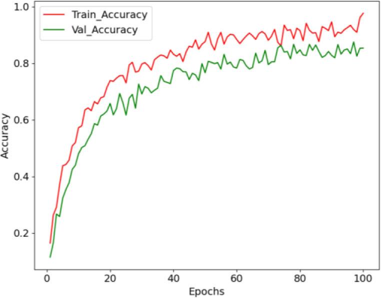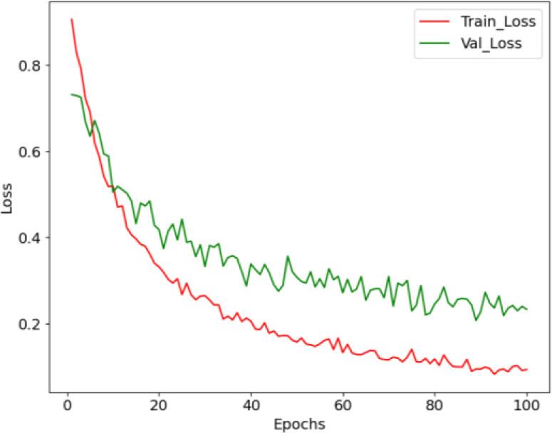 Fig. 7 shows an accuracy curve with epochs on the x-axis and accuracy rate on the y-axis. A high accuracy level of 99.60 % based on the epochs is shown by the training and testing accuracy curves. Fig. 8 displays the loss curve, with epochs on the x-axis and the loss rate on the y-axis. The proposed BTS-NEUNET performs well during testing and training.