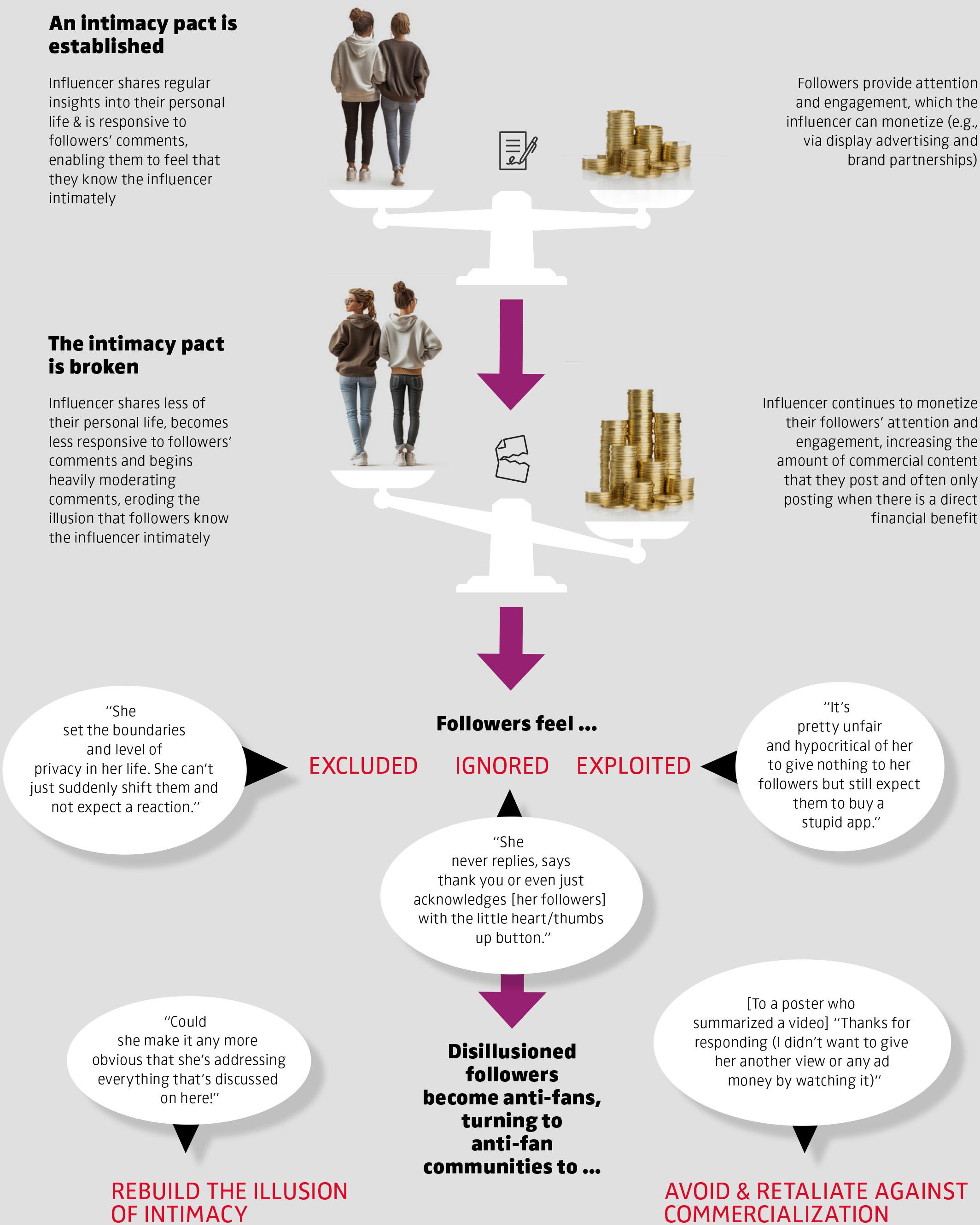 The intimacy pact is built on shaky ground, as parasocial relationships between influencers and followers are inherently one-sided, built on a carefully crafted illusion of intimacy. When influencers become more guarded about topics they once discussed freely due to increasing privacy concerns, become less committed to interacting with their growing fan base or begin to heavily moderate their comments sections in ways that censor even constructive criticism from followers, this illusion shatters, leaving followers feeling excluded and ignored. Followers’ disillusionment intensifies when influencers ramp up their commercial activity, leaving followers feeling exploited. When followers feel an influencer is no longer upholding their side of their unspoken agreement, the intimacy pact crumbles and parasocial relationships sour, with feelings of friendship and admiration quickly giving way to anger and contempt.