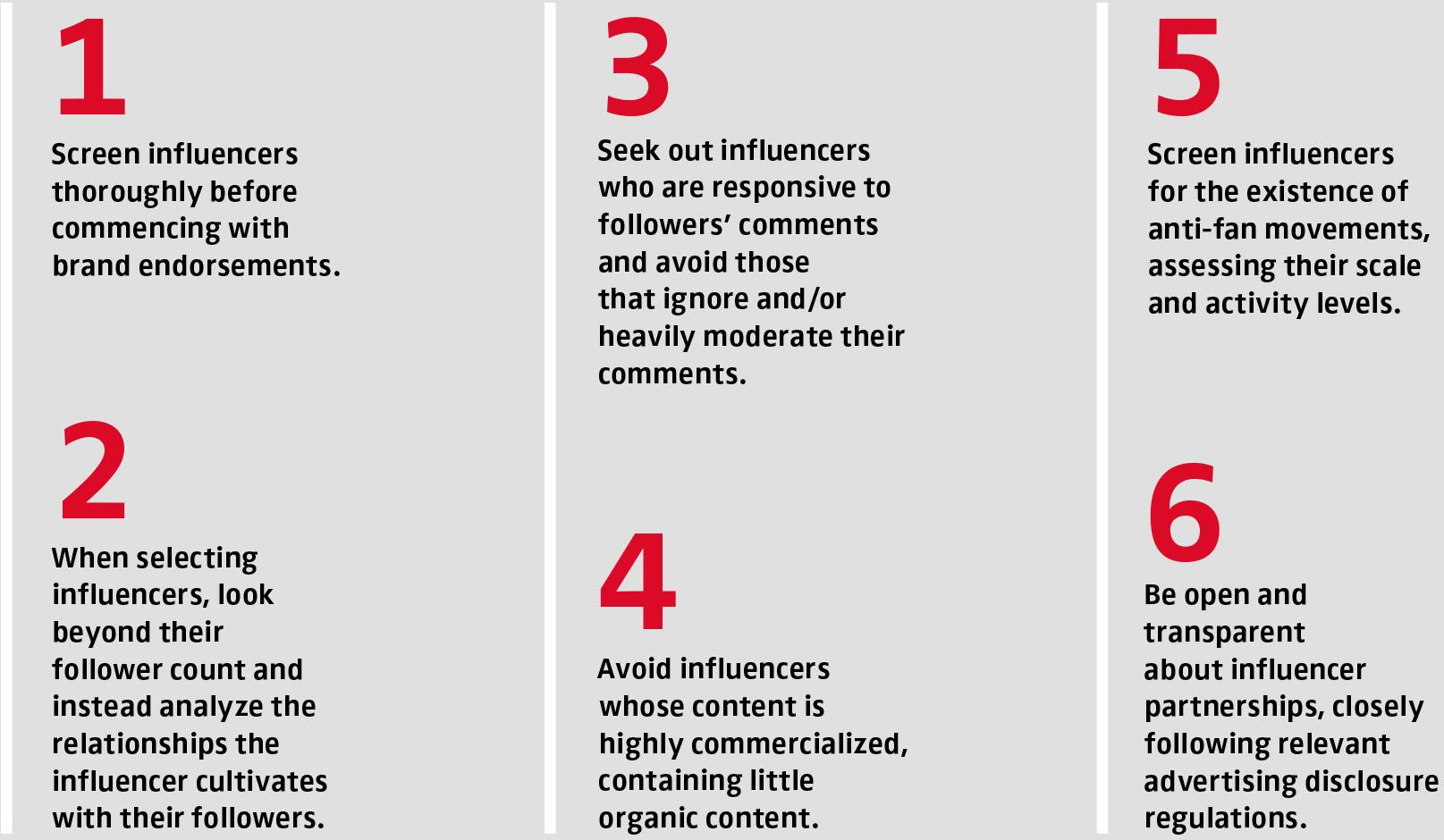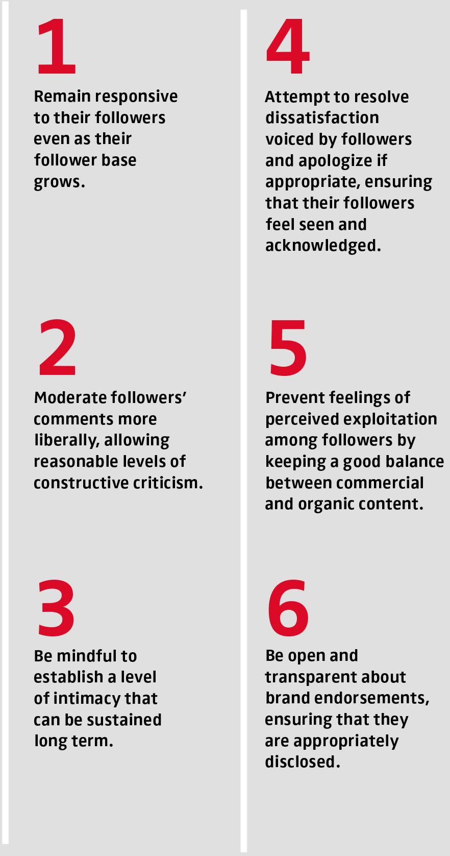 For sustainable success, influencers must preserve the illusion of intimacy that underpins the intimacy pact, particularly as their commercial activities increase. They must keep the nature and frequency of their postings at the expected level, even when there is no direct financial benefit, as followers are skeptical of influencers who only hold up their end of the intimacy pact when there is clear commercial intent. Further, they must remain responsive to their follower base even as it grows and avoid deleting or blocking critical comments on their social media content, as this motivates participation in anti-fan communities as spaces free from censorship. We recommend that influencers allow their followers to express reasonable, constructive criticism and listen and react to followers’ concerns. While this may be more time-consuming than the common censorship approach, such responsiveness enables followers to feel seen by the influencer, preserving the intimacy pact and thus reducing the likelihood and scale of anti-fan movements. Figure 2 summarizes our key recommendations to influencers.